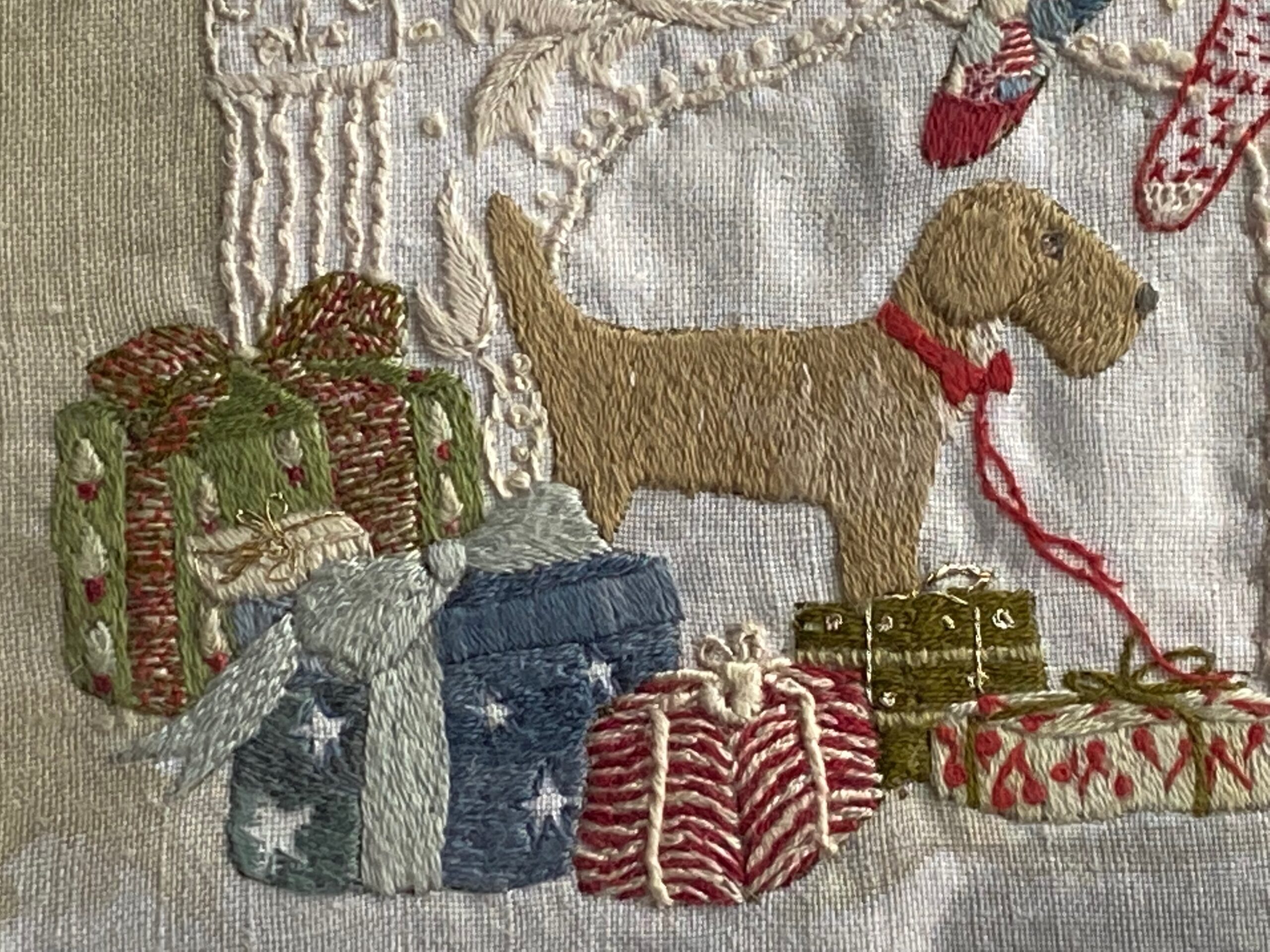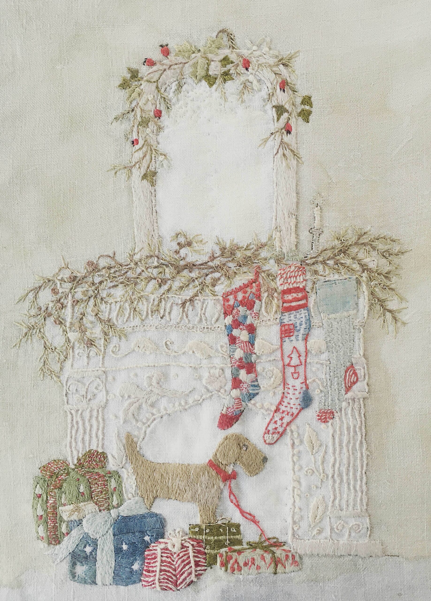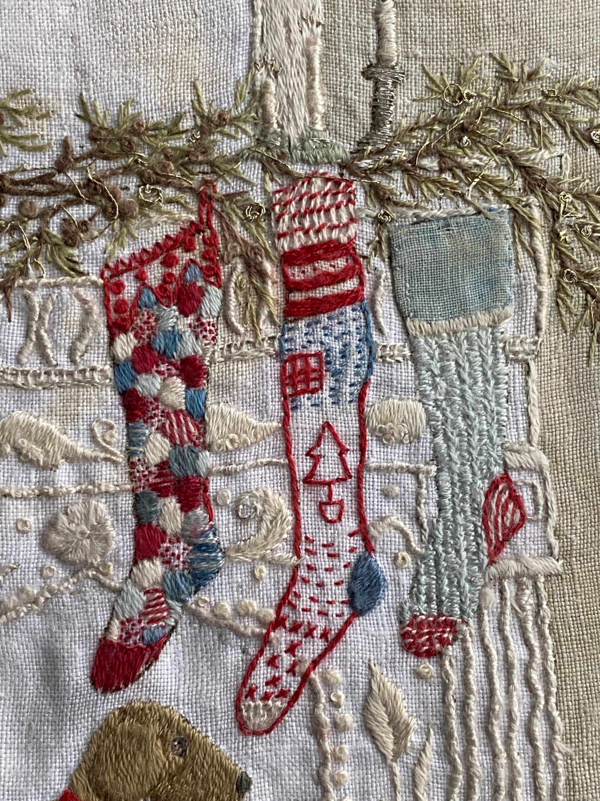 ‘The stockings were hung by the chimney with care’. This hand embroidery kit evokes the magic of the night before Christmas, something that hopefully all children will experience. The waiting, the guessing of what is in the wrapped parcels, the pleasure of wrapping something up, however young you are. The stitching is not difficult and while the kit includes full instructions there is also plenty of scope for creative self-expression in the presents, stockings and garlands — feel free to add or swap colours from your stash of embroidery threads. You can download guides for all the hand embroidery stitches on the home page of my website or take a look at the wonderful Royal School of Needlework online Stitch Bank, such a brilliant idea. You can even adopt a stitch in your name!
