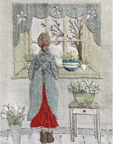 This was the first embroidery kit in the series accompanying the first eight issues of The Stitcher’s Journal. It is the kit I am most often asked to reproduce. As a pattern, it offers a lot of scope for your own interpretation in the way you fill the bowls with flowers, and if you choose to add paint to your design or not. The images, some from @jannelford on Instagram may offer some inspiration. There are also little sketches of different flowering bulbs in the comprehensive instructions. The threads used here are listed in the instructions but you may, of course, choose to use your own colours. Similarly, you could simply stitch over the flowers in the pelmet and make the pelmet plain.