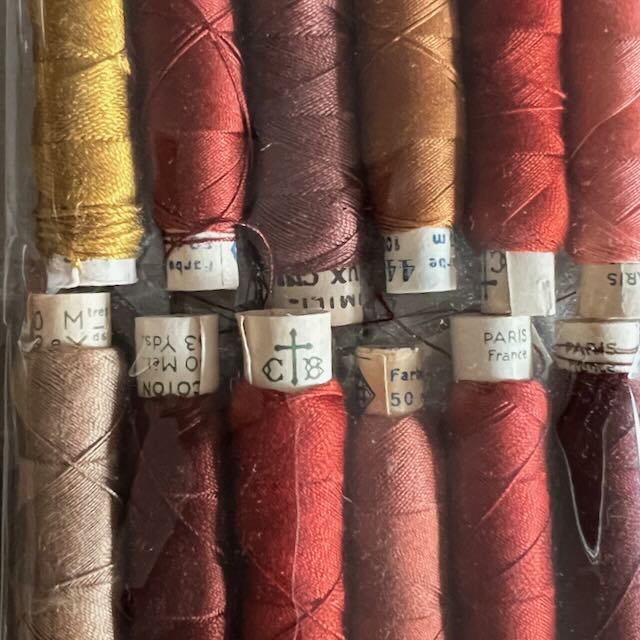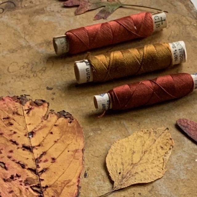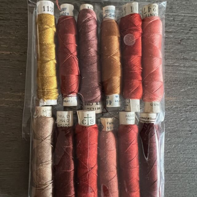 12 CARD SPOOLS OF VINTAGE SILK THREAD IN AUTUMN SHADES