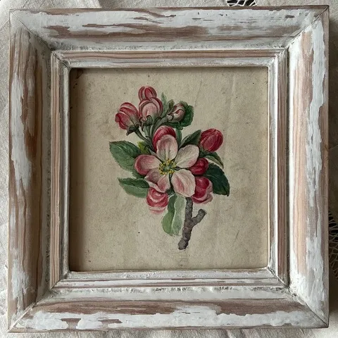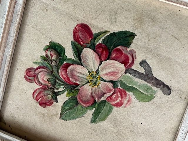 I have a weakness for watercolours and have been collecting them for several years. Many have appeared in the pages of The Stitcher’s Journal, as I feel watercolour painting is possibly the most instructive source for silk shading in embroidery. I wait patiently for the right frames to come along, a sort of yentl (matchmaler) for painting and frame. It is really unusual to find square vintage frames. I have the most wonderful framer who never baulks at being asked to use my antique frames and who frames pieces with such creativity and care. Very often, these artworks have lain in portfolios and come to auction when an elderly relative dies. I always used Art or Museum-grade glass, which increases the cost of framing, as I feel I am preserving these precious pieces of art for a new lease of life, finally, on a wall or shelf where they will be seen and enjoyed. I am pleased that they have also been recorded in The Stitcher’s Journal, of which a copy of each issue is required to be sent to The Brtitish Library.